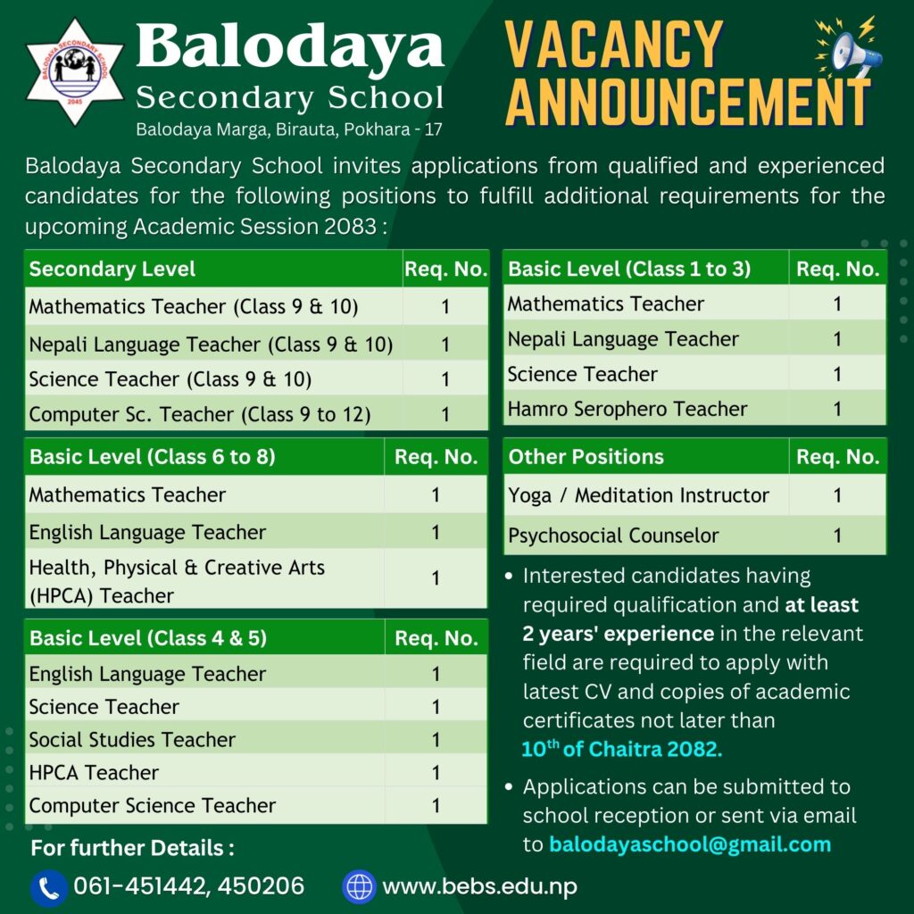 𝐀𝐃𝐌𝐈𝐒𝐒𝐈𝐎𝐍 𝐎𝐏𝐄𝐍 for 𝐀𝐂𝐀𝐃𝐄𝐌𝐈𝐂 𝐒𝐄𝐒𝐒𝐈𝐎𝐍 2082!Balodaya Secondary School announces ADMISSION OPEN for Nursery to Class 9 for the upcoming academic session 2082 in limited seats. 🔸 Application forms can be received from schools reception or can be filled online 👉 https://forms.gle/qEodXMfKBd8FiLXp9 🔸 Deadline for form submission : Chaitra 23, 2081 (Saturday) 🔸 Entrance Exam /